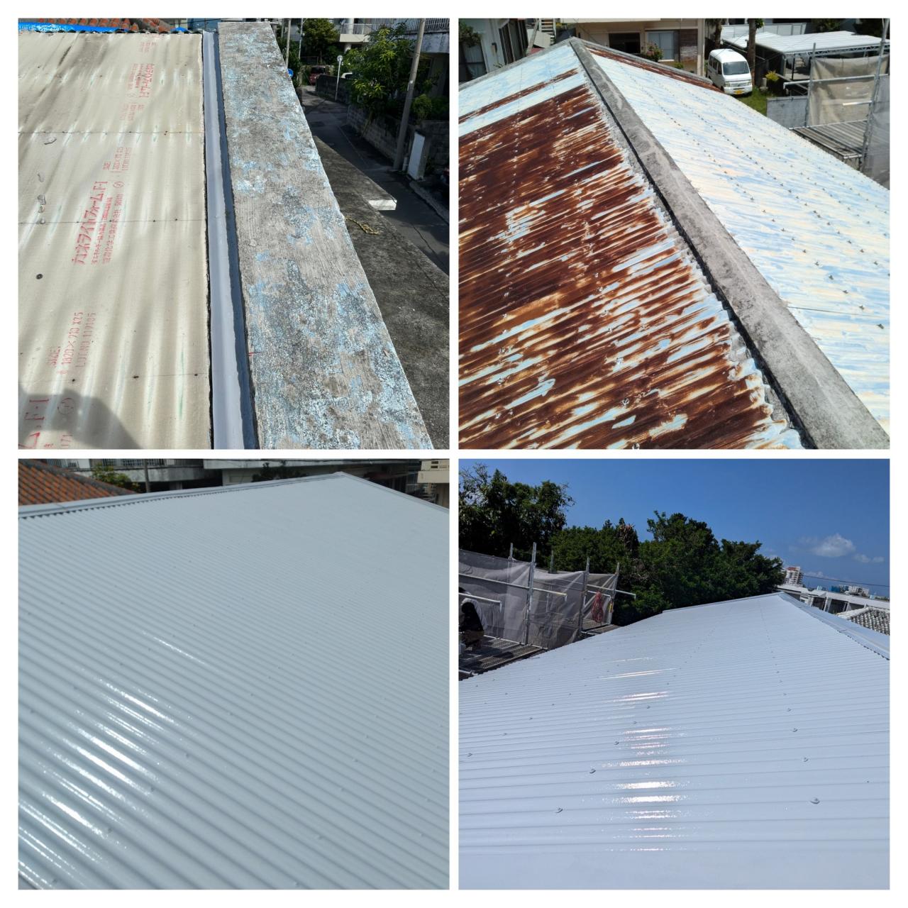 先週末からトタンの張替え工事をしました。 トタン屋根の老朽化による雨漏りが見受けられていたので、今回防水工事ではなく全面張替え工事になりました。 建物内がクーラーの冷えが悪いとの事で、遮熱塗装も提案させて頂いて施工させて頂きました。 室温も以前はクーラー付けても30度以上はあったところ、遮熱塗装する事により27度ほどに落ち着いているそうです。 事故もなく無事完了できた事に感謝です。 それでは、ご安全に!